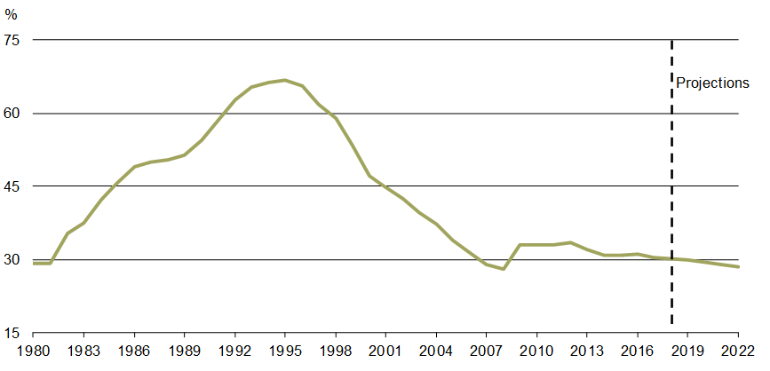 En tout, l'évolution de la situation économique et budgétaire depuis le budget de 2017, y compris les mesures annoncées dans le présent Énoncé économique de l'automne, a donné lieu à une amélioration des perspectives pour le solde budgétaire de 8,6 milliards de dollars en 2017-2018, de 8,8 milliards en 2018-2019, de 6,1 milliards en 2019-2020 et de 4,9 milliards pour chacun des deux exercices suivants. De ce fait, le récent dynamisme de l'économie et l'amélioration des perspectives budgétaires ont permis une réduction du ratio de la dette au PIB tout au long de la période de prévision.